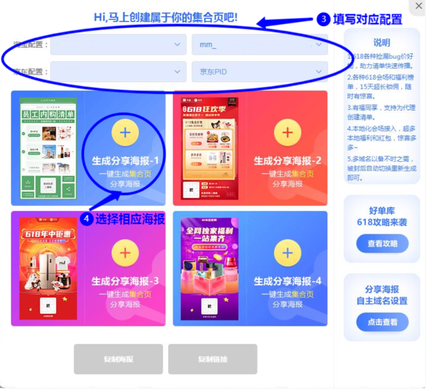 操作步骤:点击【618福利清单创建】→填写对应配置【账号】及【PID】→选择【生成分享海报】→【复制海报】或【复制链接】即可完成属于您的集合页。