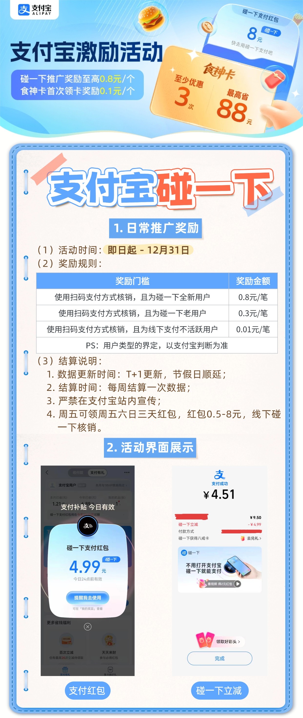 2. 【重磅活动】支付宝碰一碰红包至高0.8元/个,支付宝食神卡首次领卡0.1元/个~