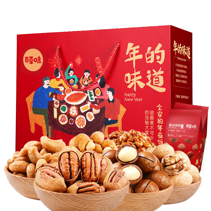 当然,也有人想要送一整套养生坚果,那就看看百草味家的坚果大礼包吧~夏威夷果,碧根果,核桃,瓜子仁...超多种坚果与水果干,年味超浓