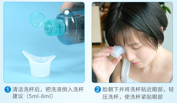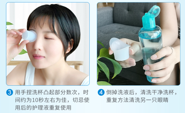 1瓶260ml,自带一个刻度小硅胶杯,用来确定用量,一只眼6ml左右,两只眼12ml。具体用法如图。▼