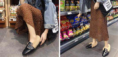 绒面加珍珠的毛毛鞋相比前一款多了一些甜美,这款因为没有了外围的兔毛,所以可以搭配上9分裤或者小脚裤,显得腿纤细而修长。