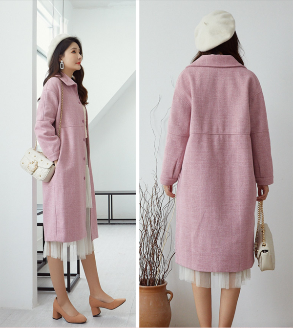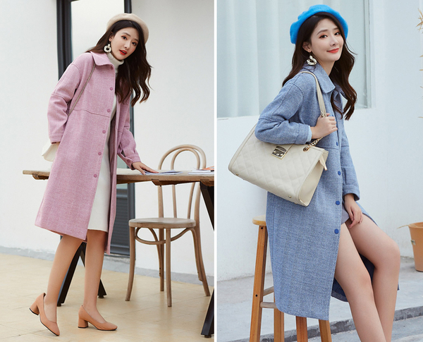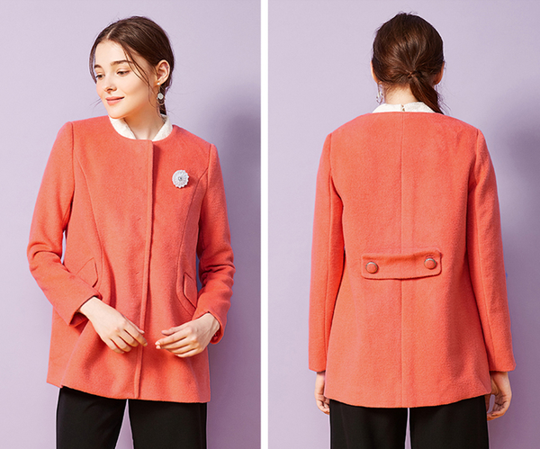 这款毛呢外套是小圆领设计的,十分有女人味,背后有两颗纽扣做了收腰设计,让整体的版型更立体,显腰线,所以不用担心穿多了变成裹粽子~