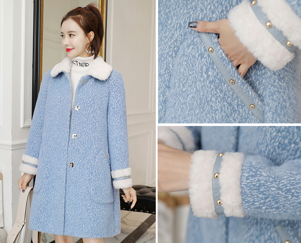 这款外套是走甜美气质风的,领口和袖口处都加白色的绒毛做点缀,摸起来柔软的手感,真的是超赞~