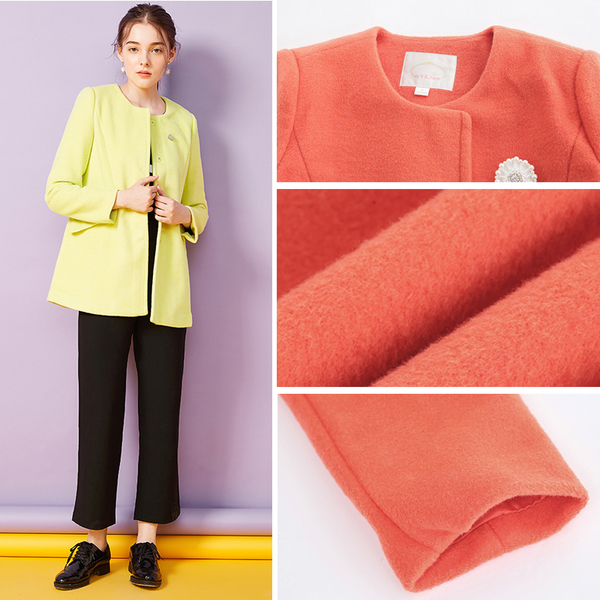 此外,这款外套是采用细针,细支纱线编织而成的,变比于其他用粗针,粗纱支编织的毛呢大衣,更不容易起球哦~
