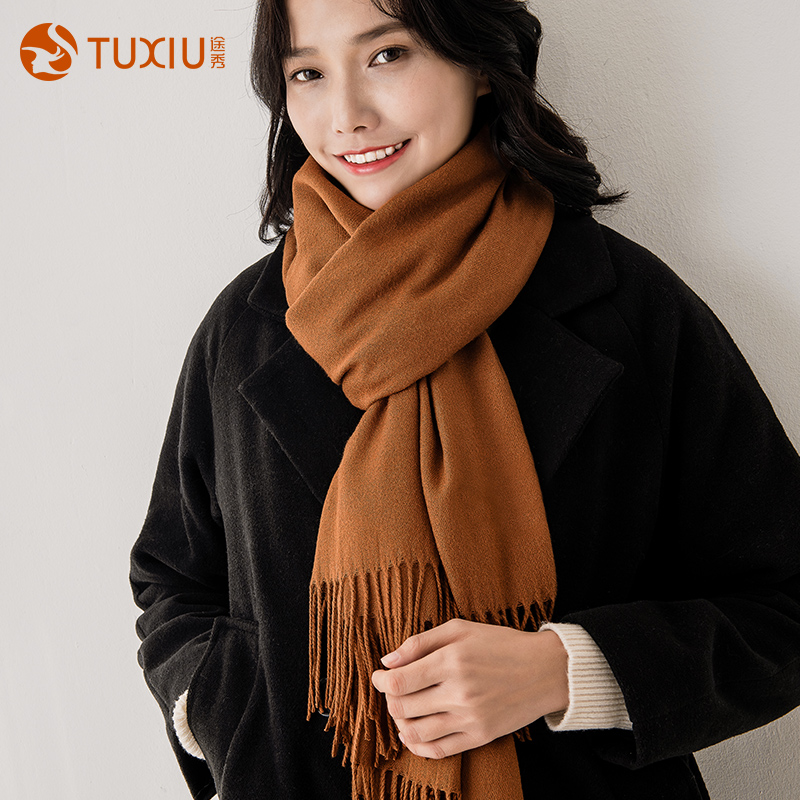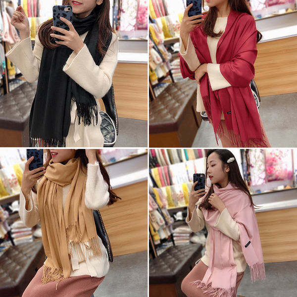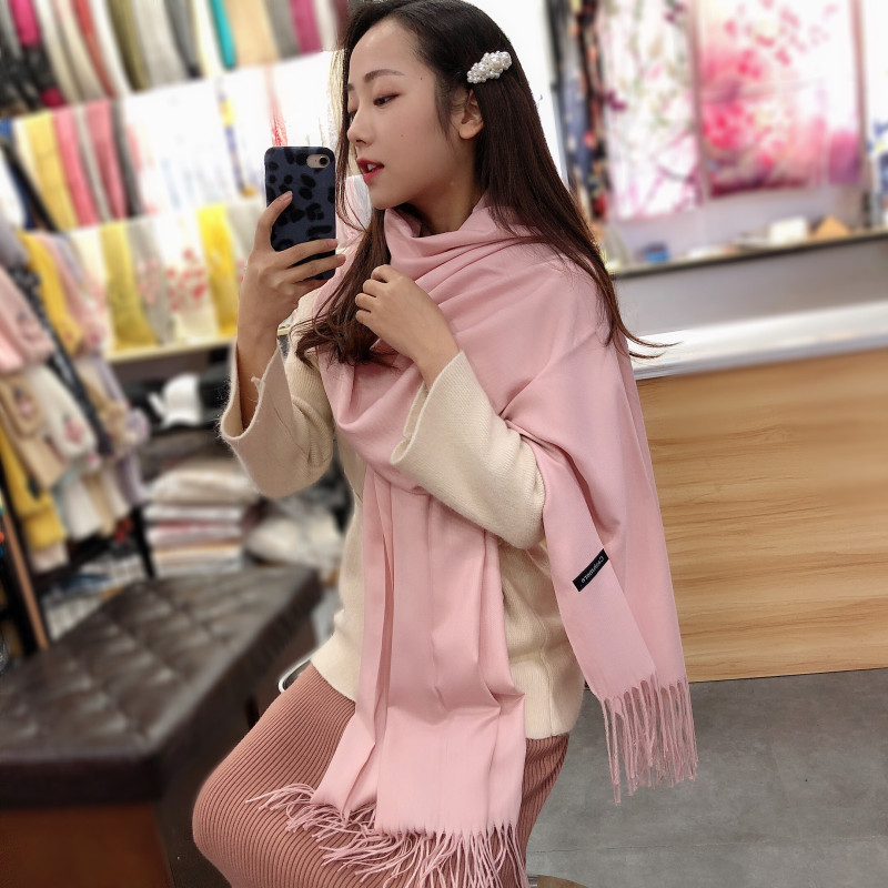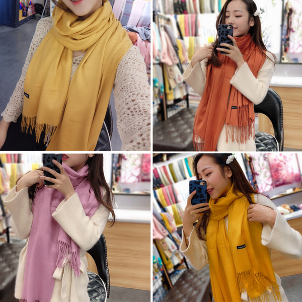 下面这款纯色围巾呢,面料是羊绒的,摸上去手感非常亲肤,简约的款式,两头用了一些流苏做点缀,戴上去气质甜美,可人。