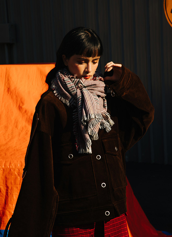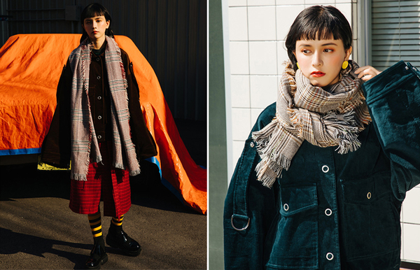 但千鸟这种小格子就不一样了,直接挂脖子上,有一番大姐大的气势,前后一搭,则是随意自然的feel,而整体围起来,千鸟格子也清晰可见,复古味十足。