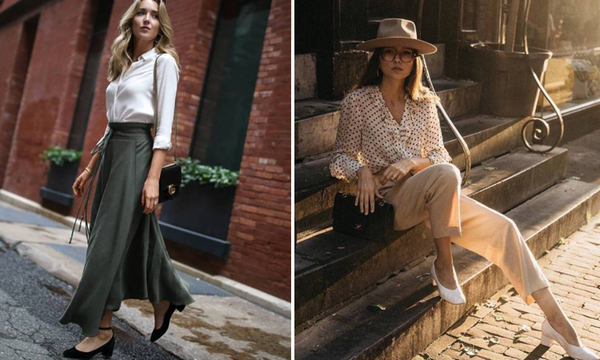 比如说上方这两位,一位白衬衫搭配墨绿色的长裙,再穿上一双黑色的小粗跟,整体就非常小香风婉约气质。