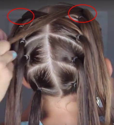 step2:左右两边头顶第一束头发各自先分成两股头发,靠里的一股左右交叉,与另一股合并,中间隔着一条马尾,与第三条马尾扎一起