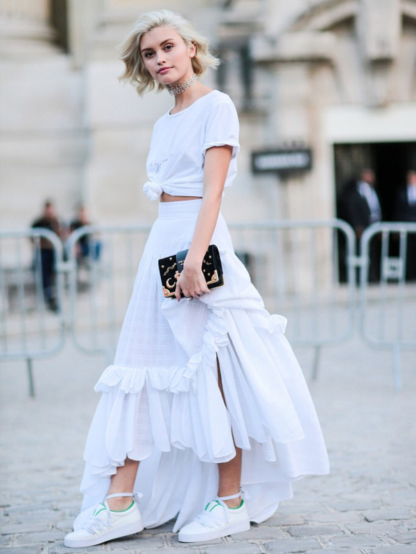 迷你星的妹子在选择白T的搭配时,下装可以选择这种半身长裙,高腰设计,有一定的蓬蓬度,可以完美的遮住你的小短腿,在视觉上显高显瘦!