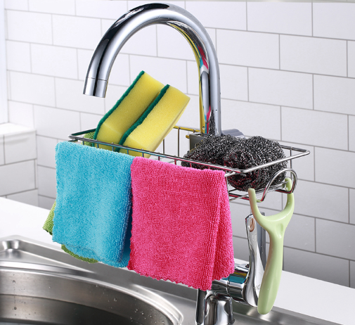这款沥水架,是直接安装在水龙头上面的,可以用来放置洗碗布、钢丝球、海绵擦等物品,侧边有挂钩,可挂削皮刀或带挂绳的物品