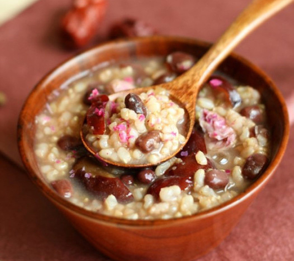 ●做法:黑米白米按1:1的比例,洗净,加水浸泡一夜。将米倒入电饭锅中,加开水熬煮。等待粥煮开时,将红枣洗净去核,切成丁,药用玫瑰花苞去蒂,备用。粥煮开后,将红枣加入一同熬煮,至米粒涨开,煮至粘稠时,将红糖放入,溶化,起锅前将药用玫瑰花瓣撒入,搅拌均匀即可。