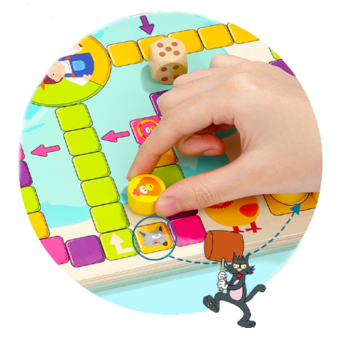 这款开心农场飞行棋,棋子上印有可爱的卡通动物形象,结合骰子数进行,不确定的玩法更能增加宝宝的兴趣