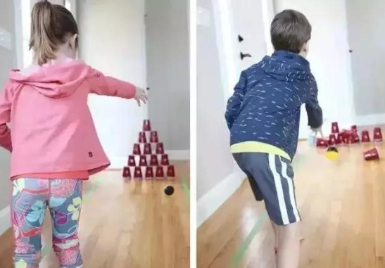 找几个空的纸杯,然后按保龄球的摆放方式在墙角摆好。再找来一个小孩子的玩具球,一个简易的迷你保龄球就完成了